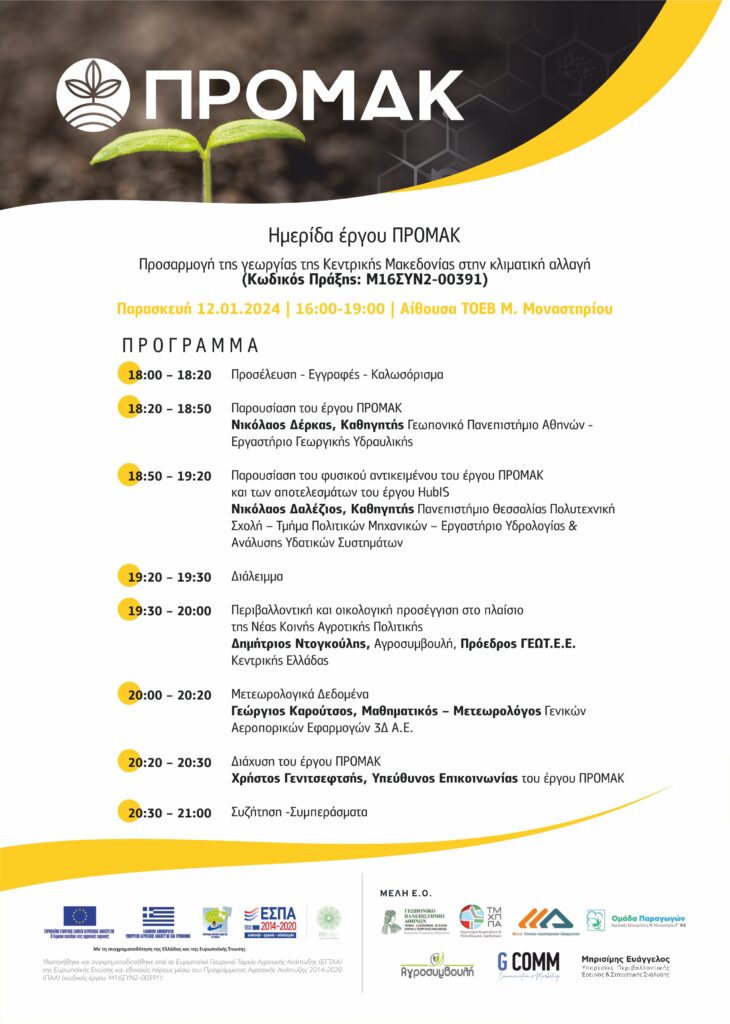 “Προσαρμογή της γεωργίας της Κεντρικής Μακεδονίας στην κλιματική αλλαγή” που θα πραγματοποιηθεί την Παρασκευή 12 Ιανουαρίου στην Αίθουσα ΤΟΕΒ Μικρού Μοναστηρίου.